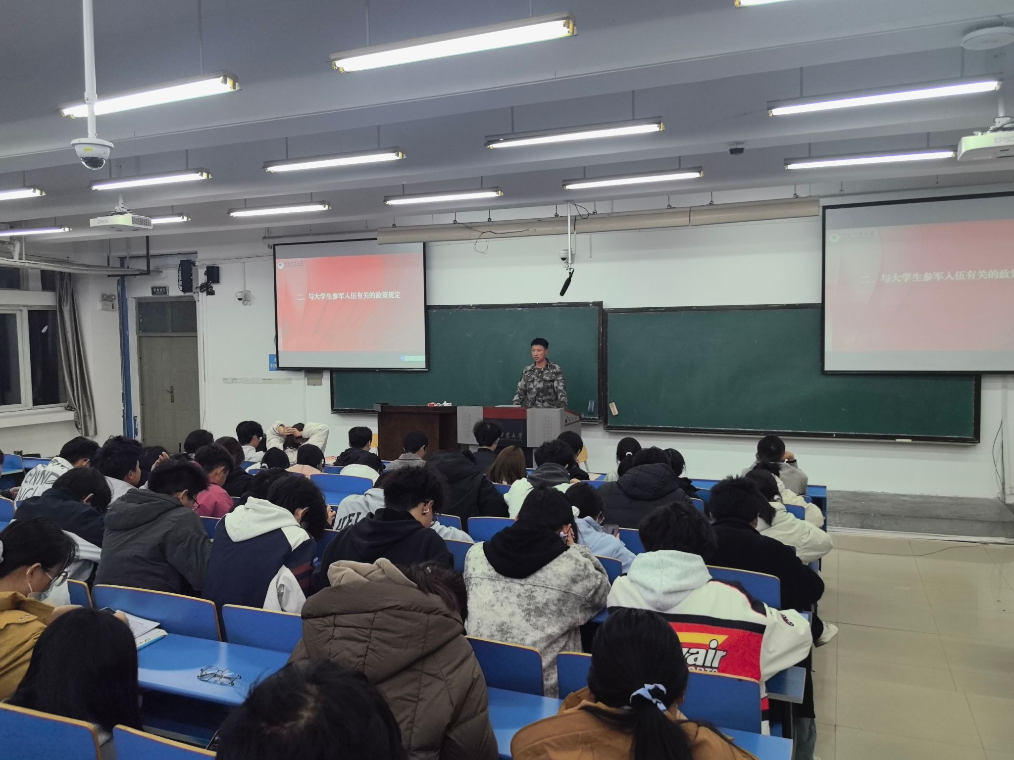 宣讲会伊始,身着戎装的宣讲员英姿飒爽地登上讲台。宣讲过程中,宣讲员们分享了亲身经历:既有在边疆严寒中坚守哨位的执着坚韧,也有抢险救灾时与战友并肩作战的无畏英勇。这些汗水与热血交织的军旅故事,让同学们深切体会到军旅生涯对个人意志的极致锤炼,以及对使命感的深度铸就。他们以激昂有力的语调,全面深入地解读参军入伍相关政策,详细涵盖入伍条件、报名流程及各项优惠政策,让同学们对参军基础信息有了清晰认知。