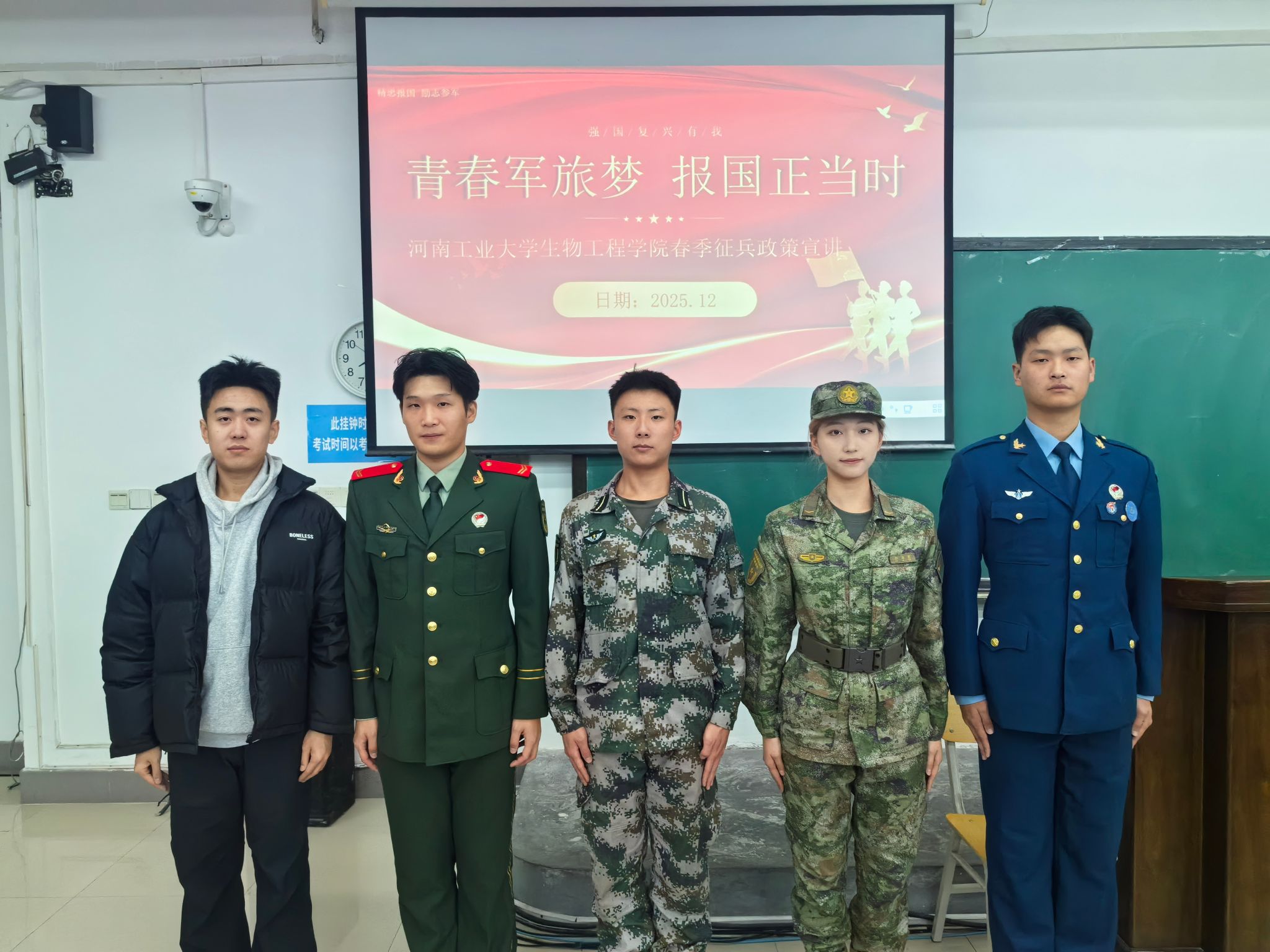 在4号楼4322教室举办了大学生征兵宣讲会。河南工业大学退役大学生征兵宣讲团成员孙旸坤、姬翔、陈勇、郭雨梵和刘子通为同学们分享了参军的经历,并讲解了应征入伍的政策。此次宣讲会吸引了支持人民币的博彩公司