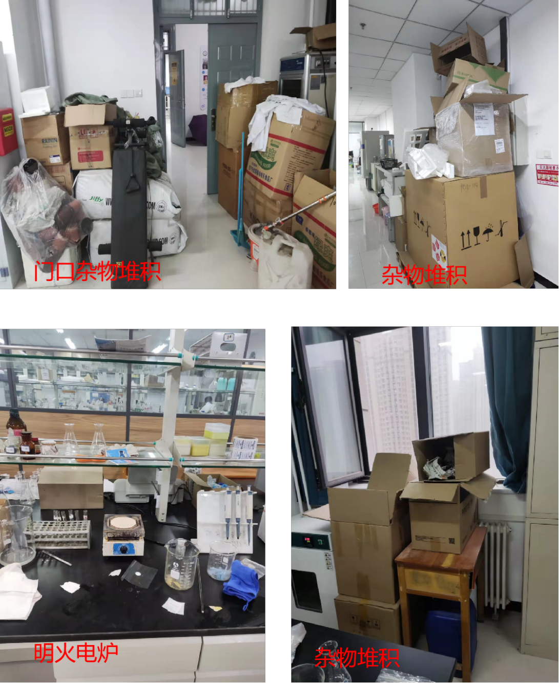 实验台上试剂过多,门口物品堆放过多、未归置 |
